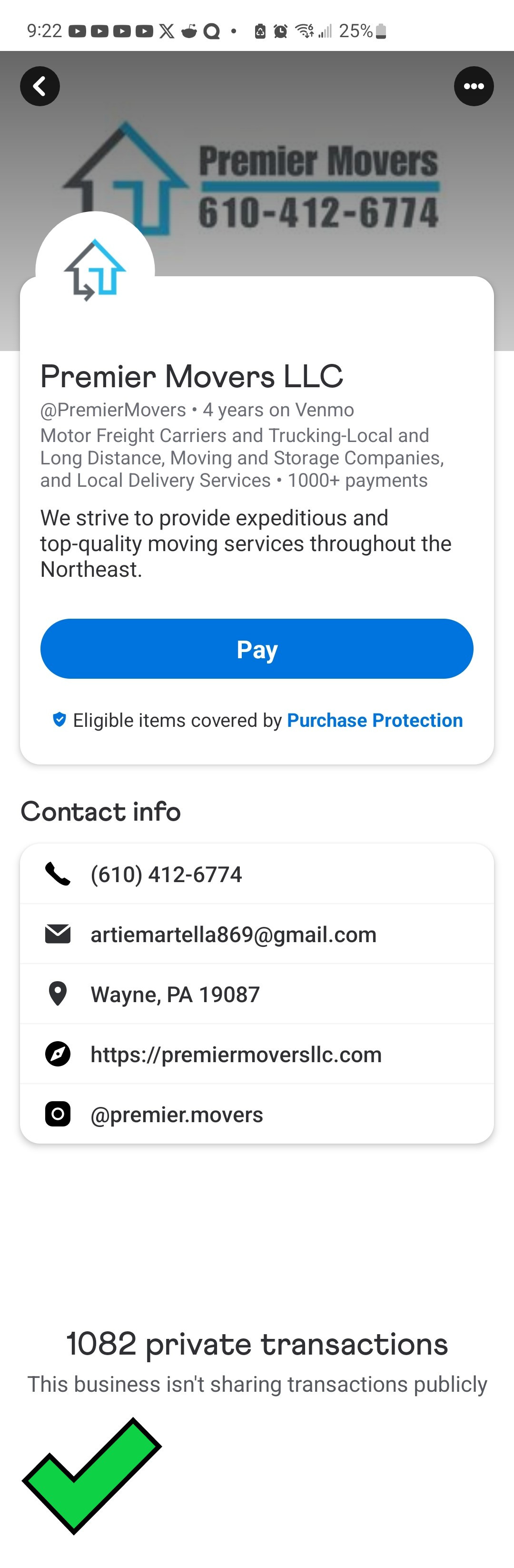 The other business I found, Premier Movers, LLC, is doing it correctly. They have all of their business details but obfuscate the payment transitions with clients.