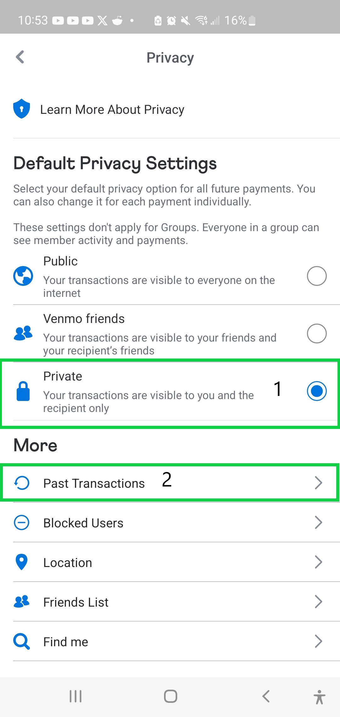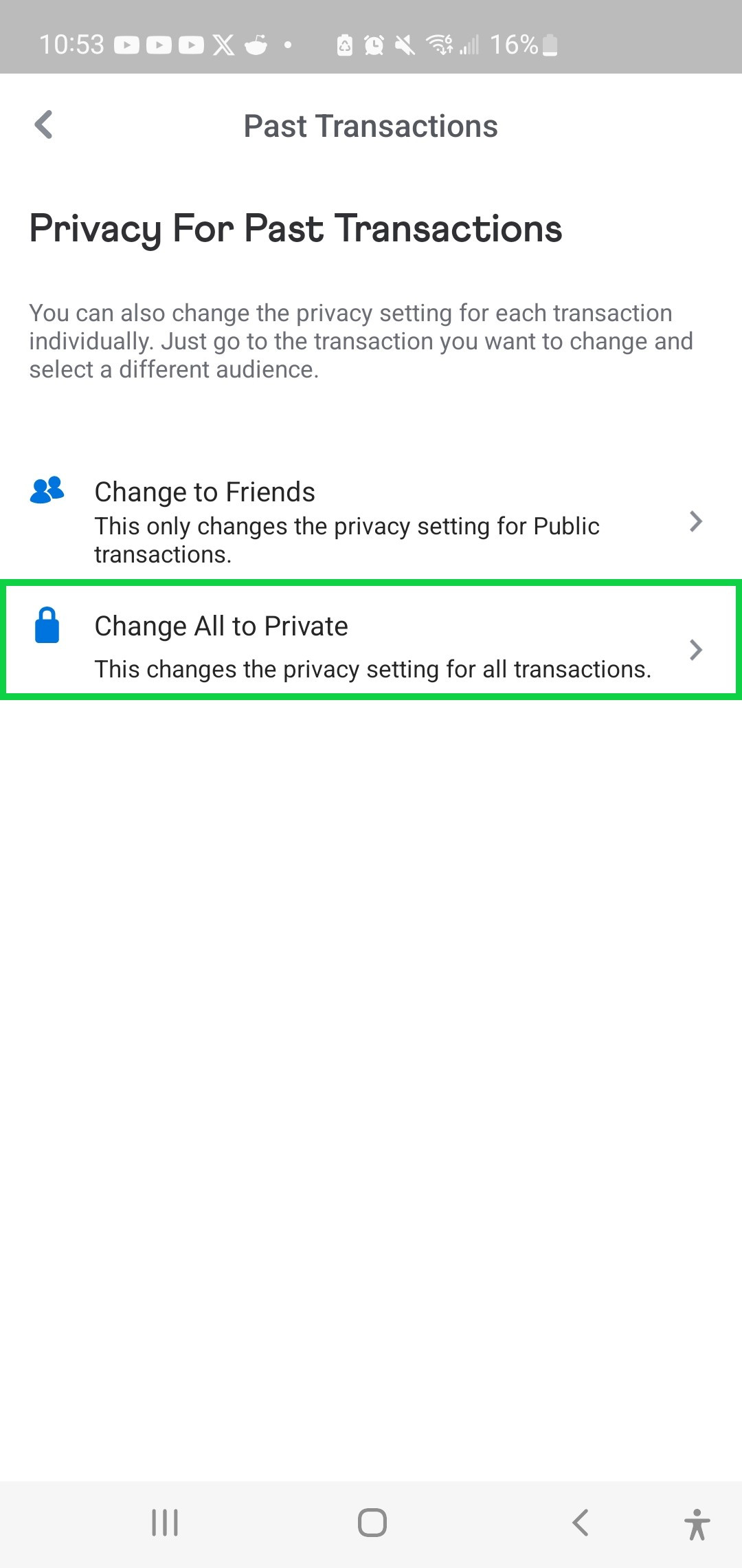 Update Past Transactions: Still in the Privacy section, look for "Past Transactions" or "More." Tap it, then select "Change All to Private." Confirm the action (you may need to do this twice for verification).
